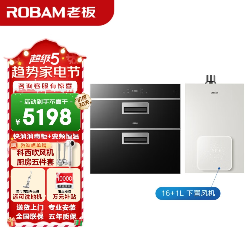 老板(Robam)消毒柜家用嵌入式消毒碗柜105L低温快消预约消毒自动换气 16L智能恒温燃气热水器XZ716A+HD660A-16价格:5098.00元!