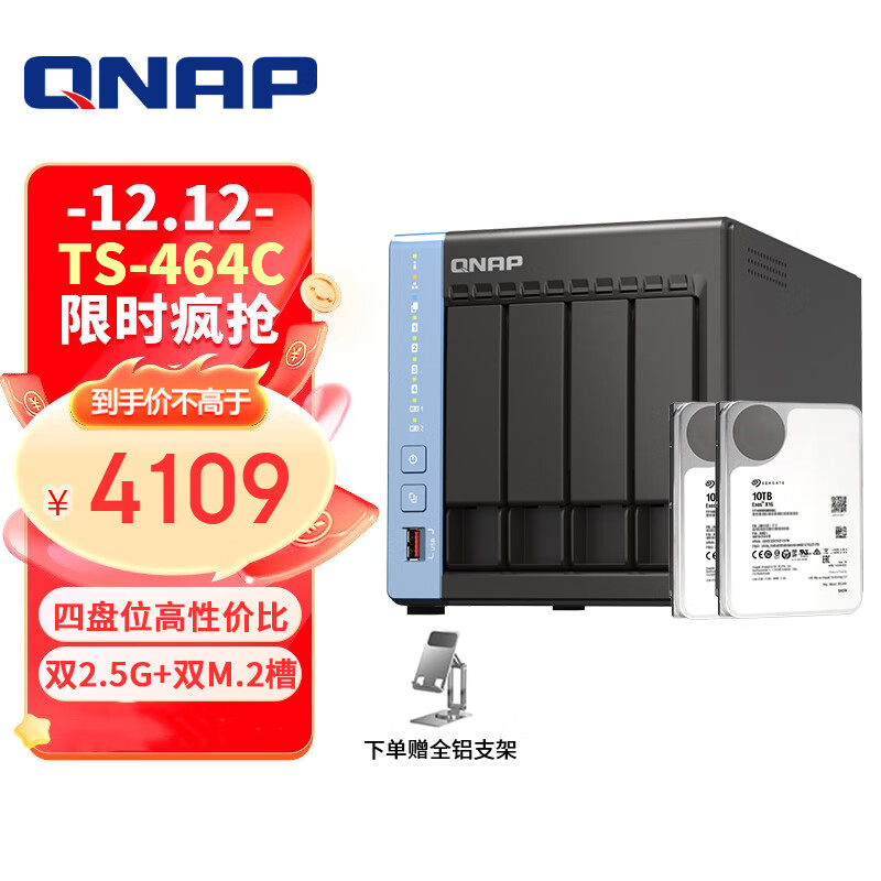 威联通(QNAP)TS-464C 魔方 四核器网络存储服务器内置双M.2插槽NAS私有云(含企业盘10T*2)价格:4799.00元!