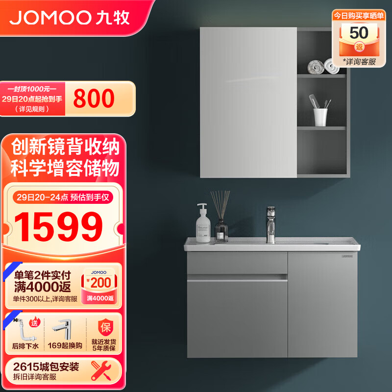 九牧(JOMOO)现代极简浴室柜陶瓷一体盆洗脸盆大收纳柜组合70cm A2715-13HU-5价格:1599.00元!