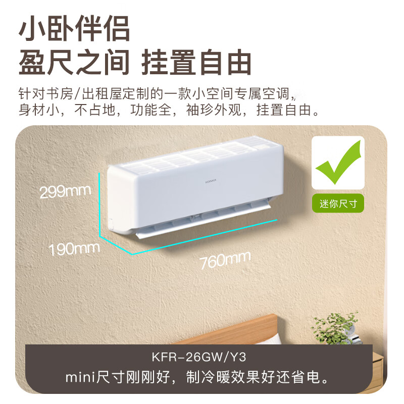 康佳(KONKA)大1匹 新能效 快速冷暖 舒适节能 变频壁挂式空调挂机 以旧换新 KFR-26GW/Y3价格:1599.00元!