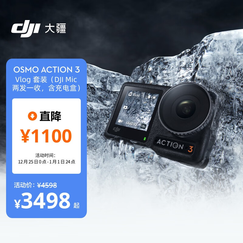 大疆 DJI Osmo Action 3 Vlog 套装(DJI Mic 一拖二) 运动相机 高清防抖Vlog手持摄像机+随心换2年版实体卡价格:3687.00元!