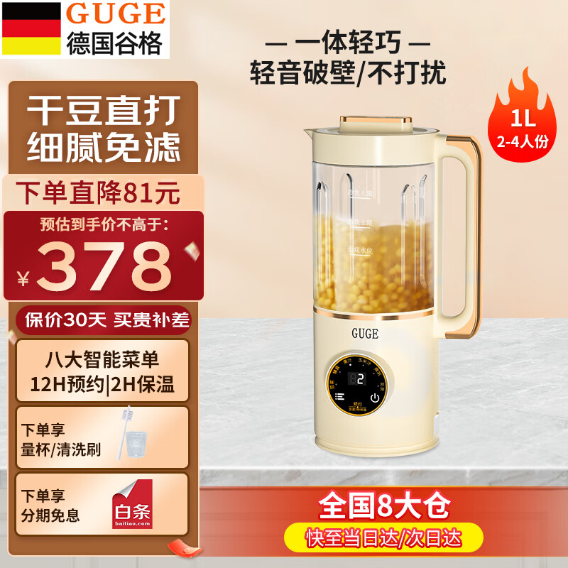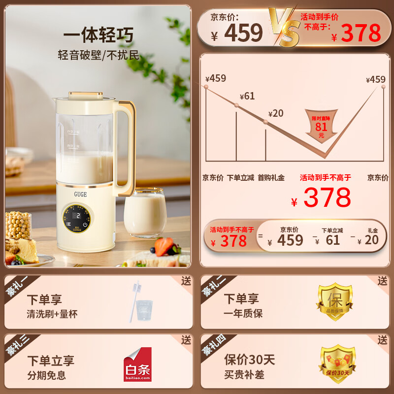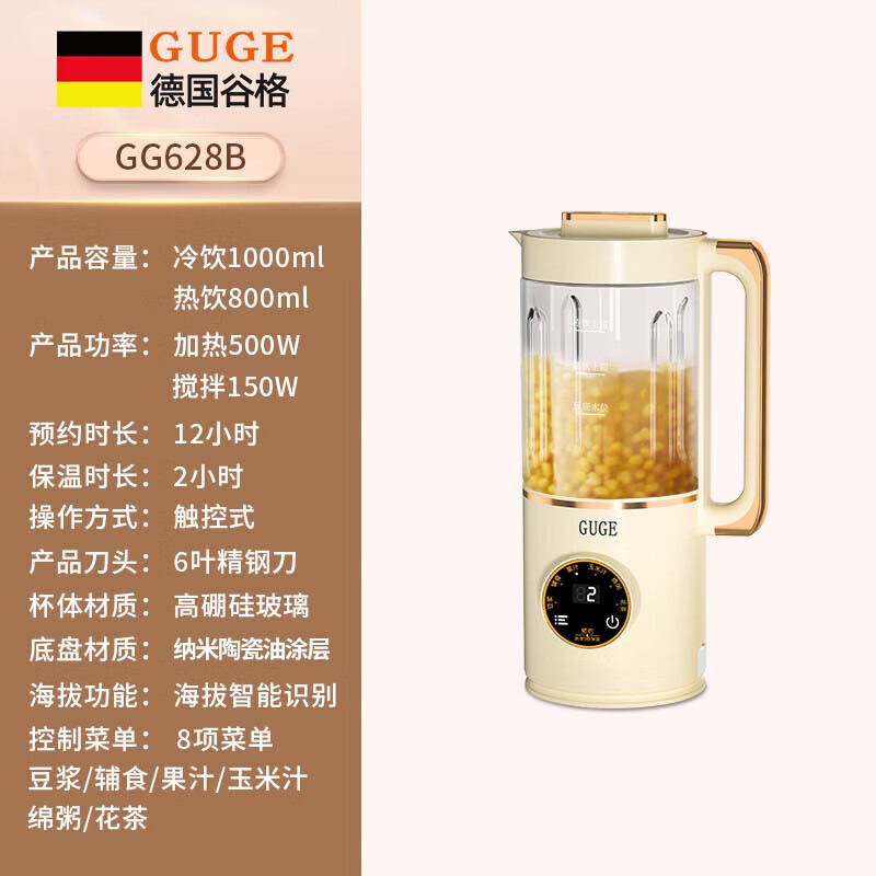 谷格(GUGE)【预约保温,免洗单人】德国破壁机家用小型低音静全自动多功能料理机五谷杂粮榨汁机迷你豆浆机 【升级版】1L|低音破壁价格:459.00元!