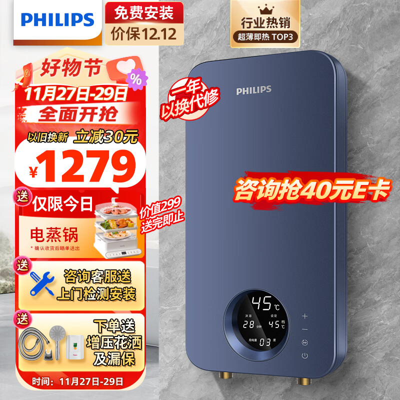 飞利浦(PHILIPS)即热式电热水器 电即热8500W速热无极变频智能恒温无胆免储水 淋浴洗澡水电分离AWH1028/93价格:1379.00元!