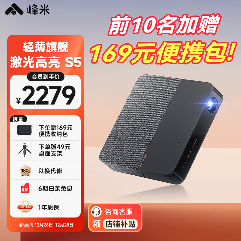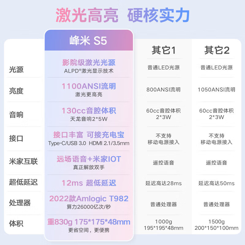 峰米S5 激光投影仪家用 家庭影院超高清电视 便携手机投影机(ALPD影院激光 天龙音响 米家智联 可连充电宝)价格:2299.00元!