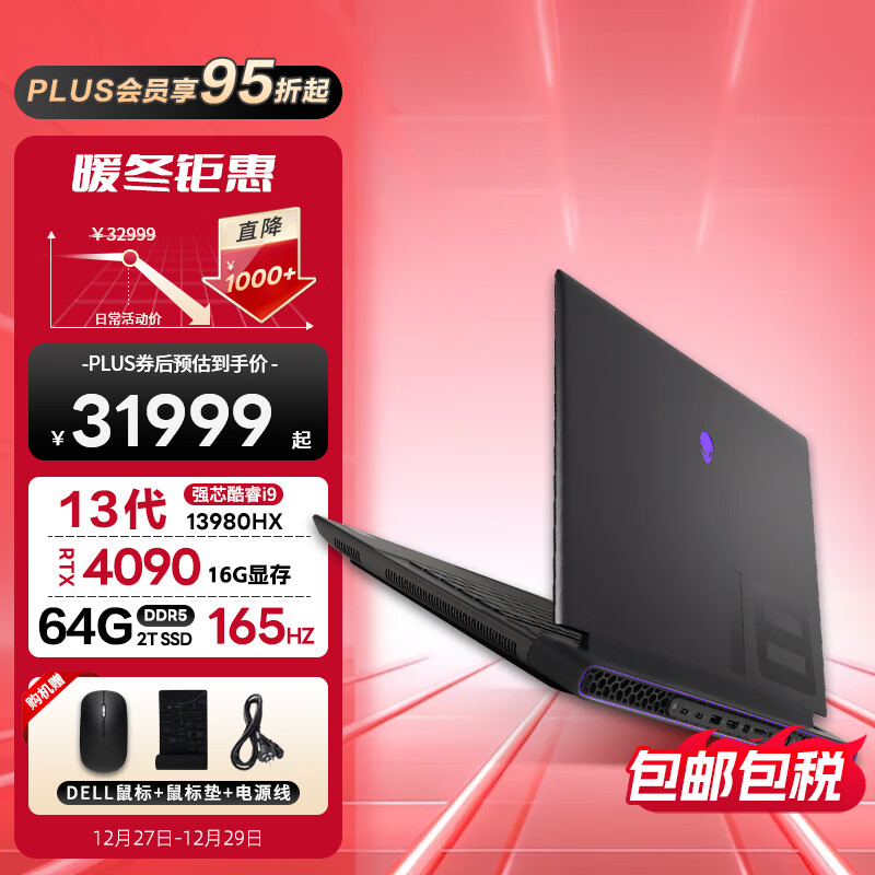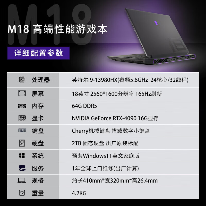 外星人(Alienware)全新M18 R1 高端电竞游戏本笔记本电脑 13代i9-13980HX RTX4090 64G 2T 2560x1600-165HZ 机械键盘价格:32999.00元!