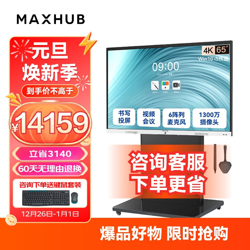 MAXHUB视频会议平板一体机教学触控会议电视书写投屏内置摄像头麦克风新锐Pro65 Win10+商务支架+传屏+笔价格:14159.00元!