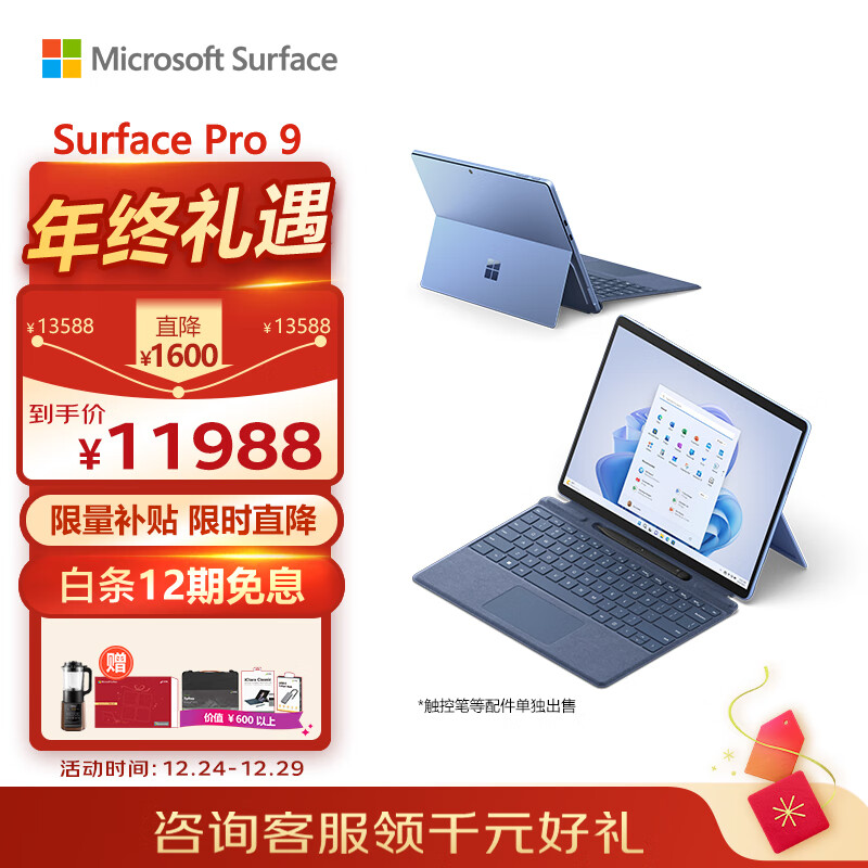 微软Surface Pro 9 二合一平板电脑 宝石蓝+宝石蓝键盘盖 i7 16G+256G 13英寸120Hz触控屏?商务办公笔记本价格:11988.00元!