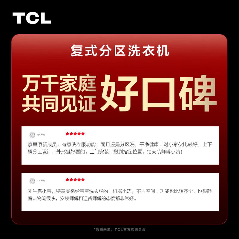 2、tcl洗衣机不亏是大牌,颜值高,而且功能齐全。我老婆马上要生了,非常需要一个子母洗衣机,这样很方便,不用再分开购买两个洗衣机了。小宝宝的衣服也能洗了。而且价格实惠,又是官方店,不用担心任何售后,买的放心,用的更安心。