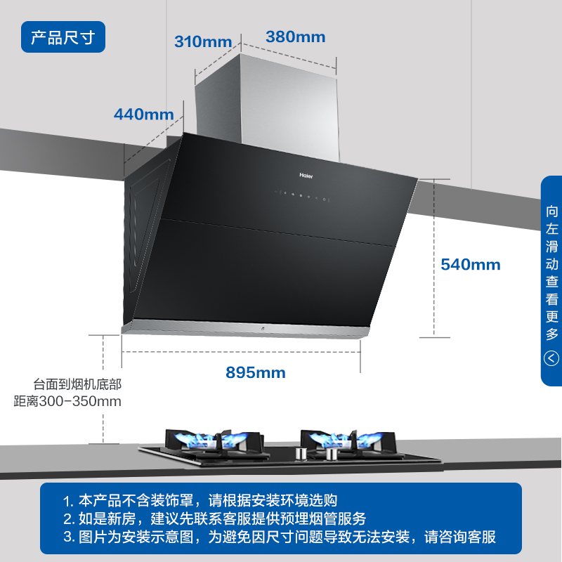 4、对比了其它款的油烟机后,购买了此款海尔油烟机,安装后感觉吸力较足,挥手感应开关灵敏也挺方便的,整体不错,后面再用用看怎么样。