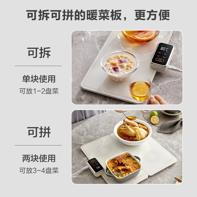 5、第天气转凉,饭菜易凉,无易间看到暖菜板,多方比对后,选择了苏泊尔这款,收货后打开,感觉颜值很高,用起来也很好操作,三块板很容易拿开合上,每块板可以分别控温。开120℃,中午的菜到晚上可以直接吃。水壶也可以一直温着喝热水。而且很好清洁,一擦就干净了。