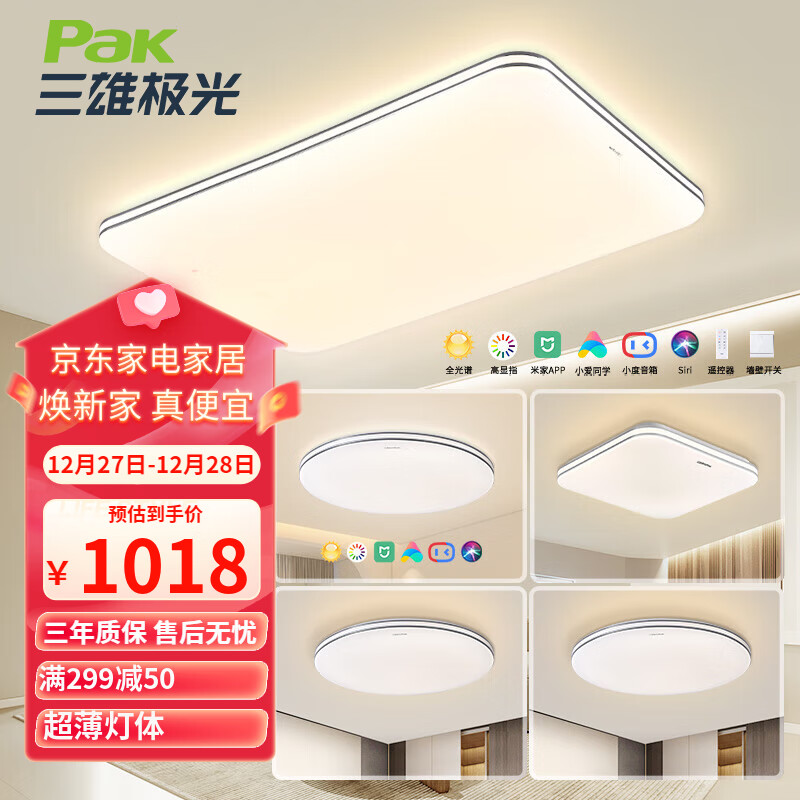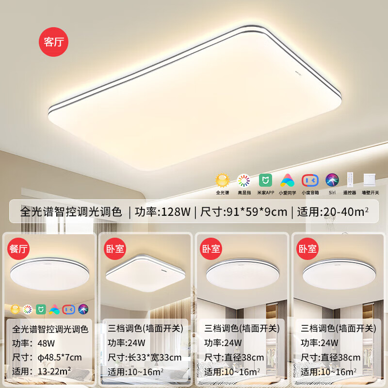 三雄极光AI语音智能客厅灯led吸顶灯超薄米家智控调光调色柔线5灯套装价格:1068.00元!