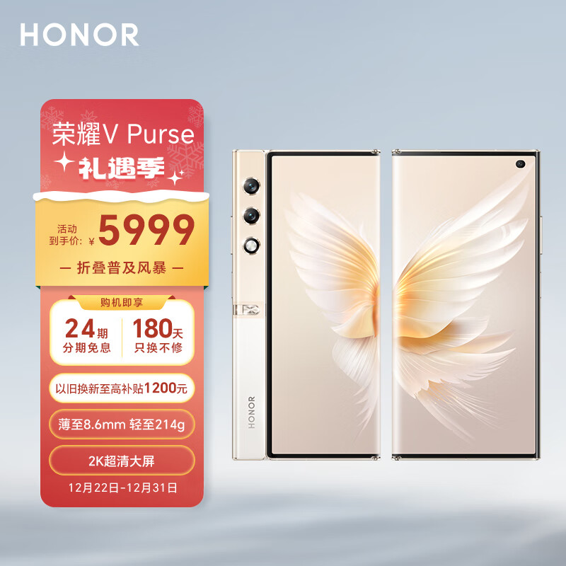 荣耀V Purse 折叠屏 8.6mm超轻薄 2K超清大屏 超自由写真相机 5G手机 16GB+256GB 山茶金价格:5999.00元!