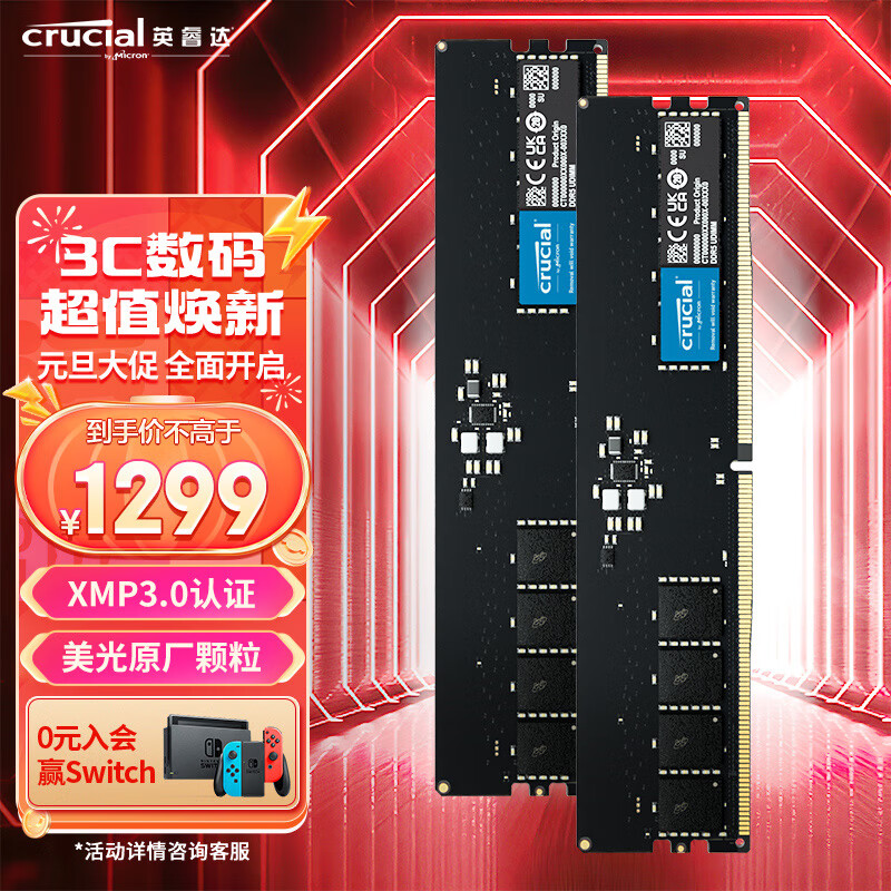 英睿达(Crucial)64GB(32GB×2)套装 DDR5 4800频率 台式机内存条 美光原厂颗粒价格:1299.00元!