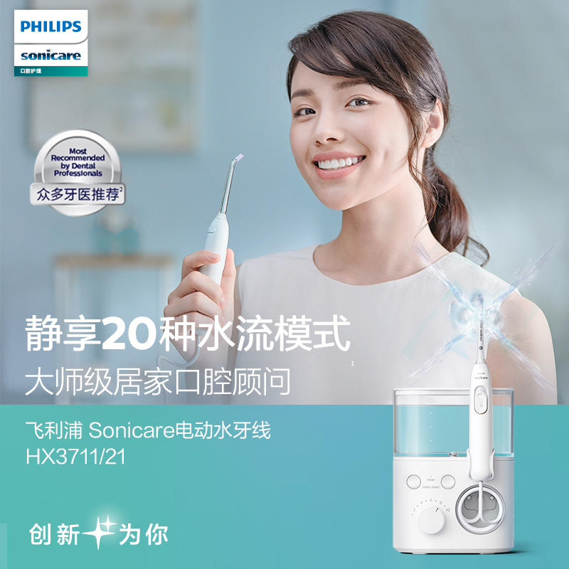 飞利浦家用台式冲牙器洗牙器水牙线 台式家用 四向水流科技2种洁齿模式10级洁齿力度水魔方白色HX3711/21价格:899.00元!