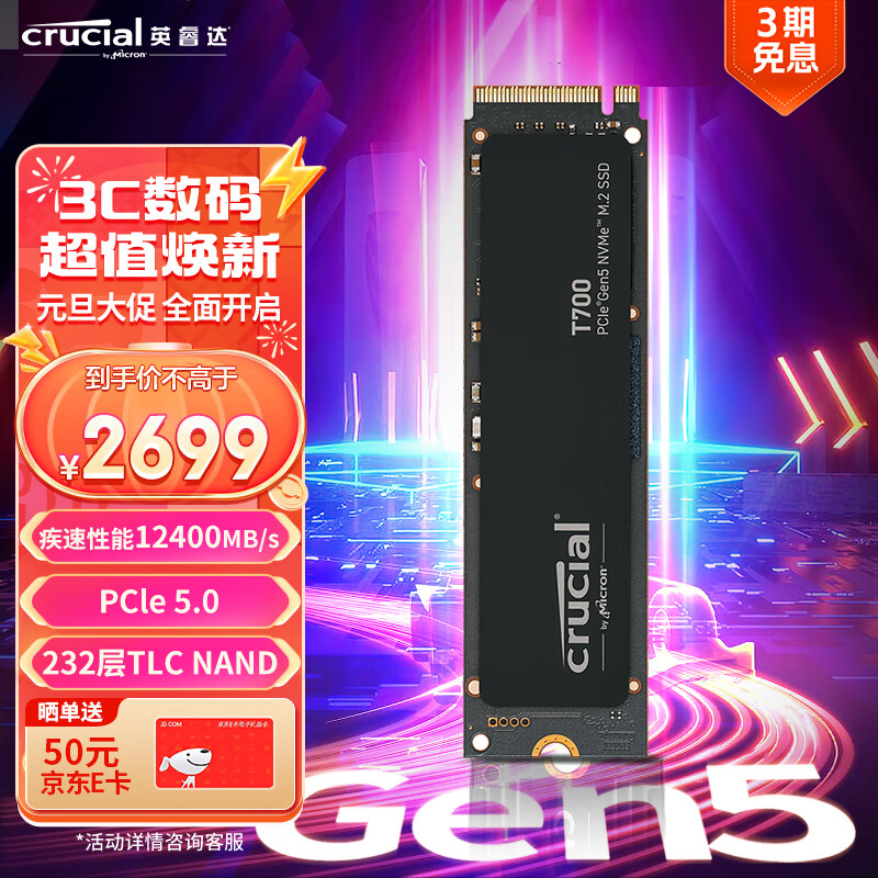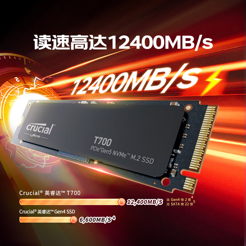 英睿达(Crucial)美光 2TB SSD固态硬盘 M.2接口(NVMe协议)四通道PCIe5.0 读速12400MB/s Pro系列T700价格:2699.00元!