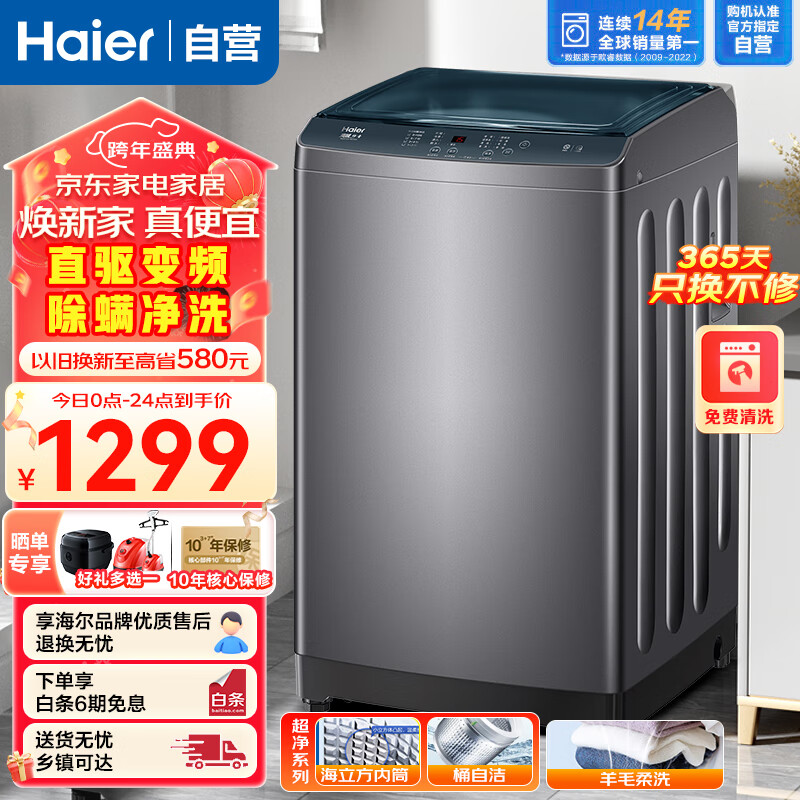 海尔(Haier)10KG洗衣机自动波轮直驱变频一级能效超净洗除螨洗智能预约自编程XQB100-BZ506价格:1299.00元!