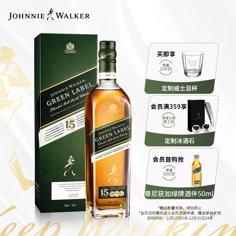 尊尼获加(JOHNNIE WALKER)【节日送礼】绿方 绿牌 15年 苏格兰 调和型 威士忌 洋酒 750ml价格:319.00元!
