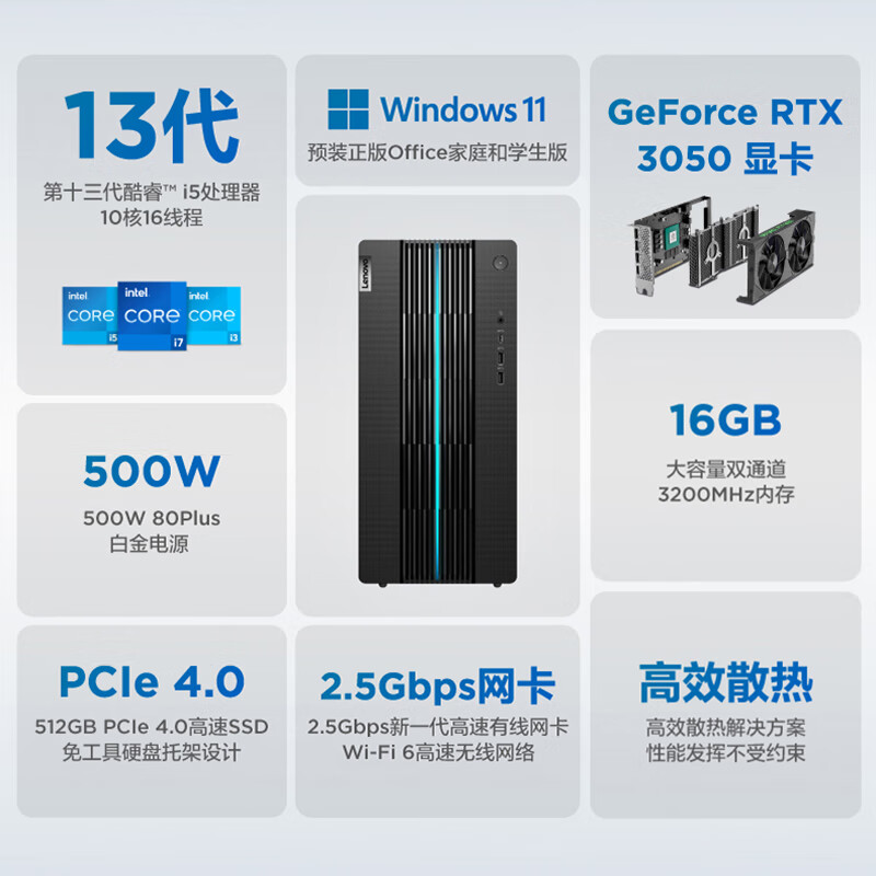 联想(Lenovo)GeekPro 2023设计师游戏台式电脑主机(13代i5-13400F RTX3050 16G 512GB SSD )价格:5499.00元!