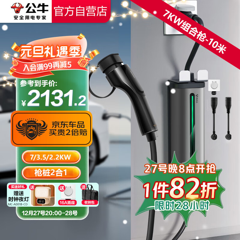 公牛(BULL)便携式充电桩充电枪随车充适用比亚迪极氪等7KW/3.5KW枪桩2合1固定便携两用10M价格:2599.00元!
