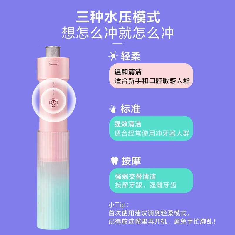 3、贝医生家的冲牙器非常便携漱口水也满满一大瓶很实惠味道非常清凉有淡淡的蜜桃味漱口结束用冲牙器冲一冲不仅可以去除牙石和细菌还能进一步去除牙膏残留颜值方面非常可爱自然保护牙齿爱自己