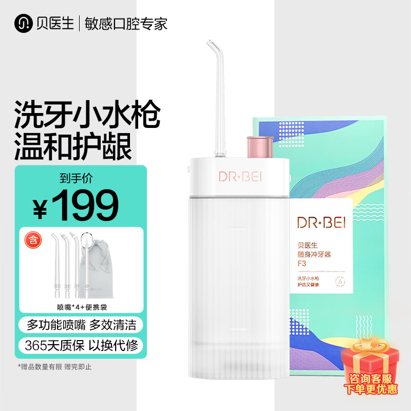 贝医生(DR·BEI) 冲牙器便携家用洗牙器洁牙器水牙线清洁口腔牙套清洗牙石礼物送女友老婆 清洁亮白护龈送爱人礼物 限定礼盒冲牙器F3定制款【内配4喷嘴】价格:299.00元!