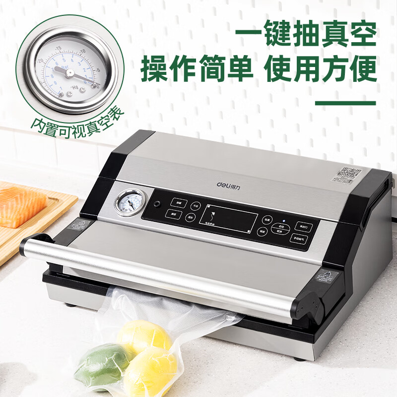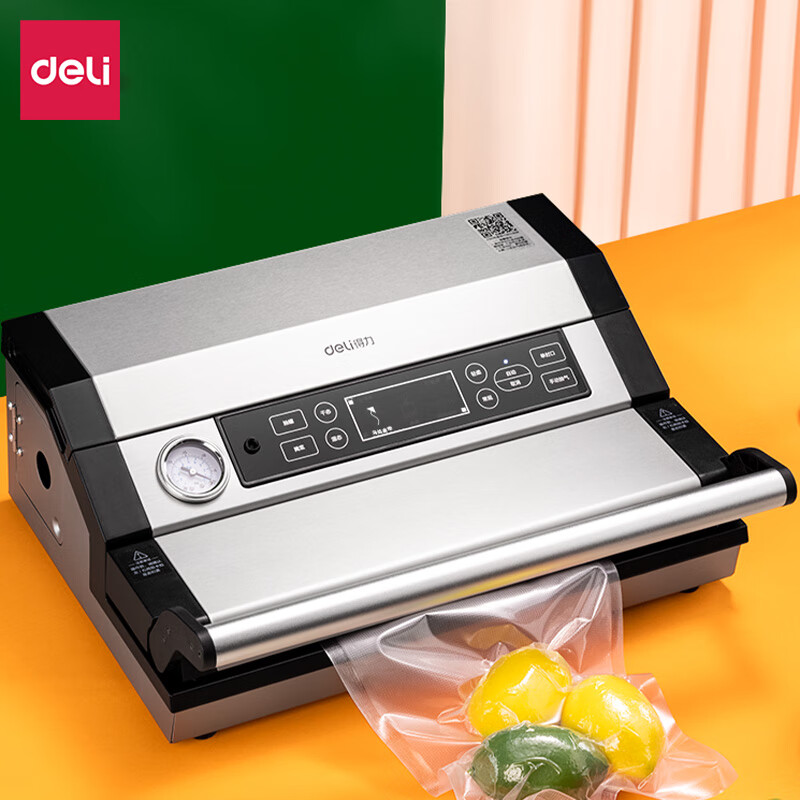 4、得力的一款性价比超高的真空机,吸力很大,声音很小,支持单封口,手动吸真空。分两个吸力强度,还有外接真空管。真心省心,非常满意。