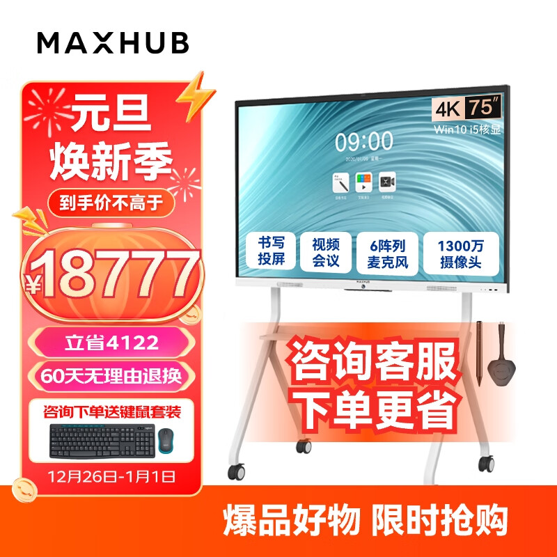 MAXHUB视频会议平板一体机直播展示触控会议电视书写投屏内置摄像头麦克风新锐Pro75 Win10+时尚支架+传屏+笔价格:18777.00元!