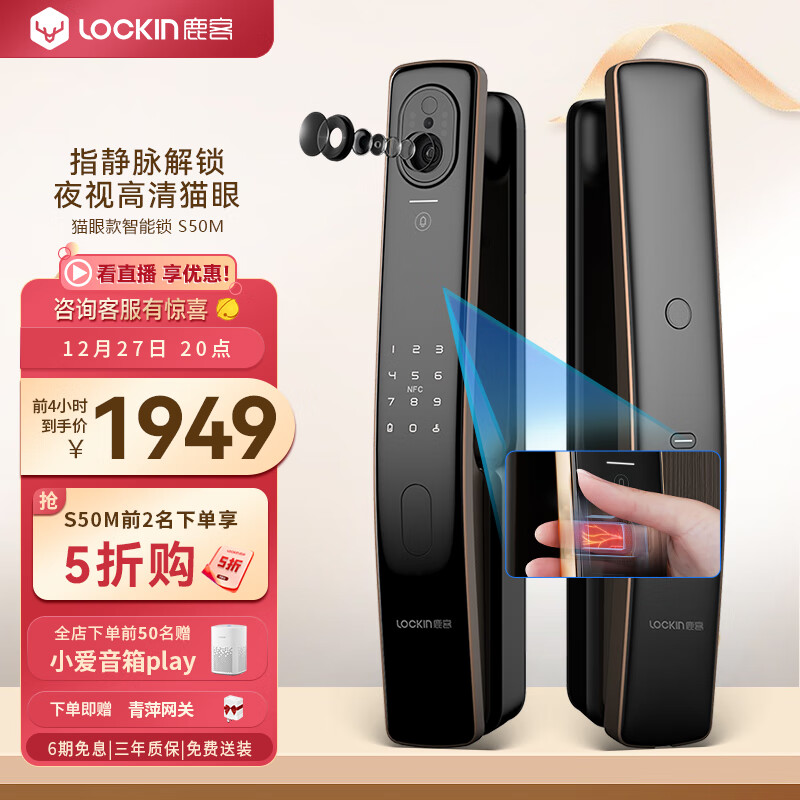 鹿客(LOOCK)S50M可视猫眼指静脉智能门锁密码指纹电子锁支持APP智联价格:3299.00元!