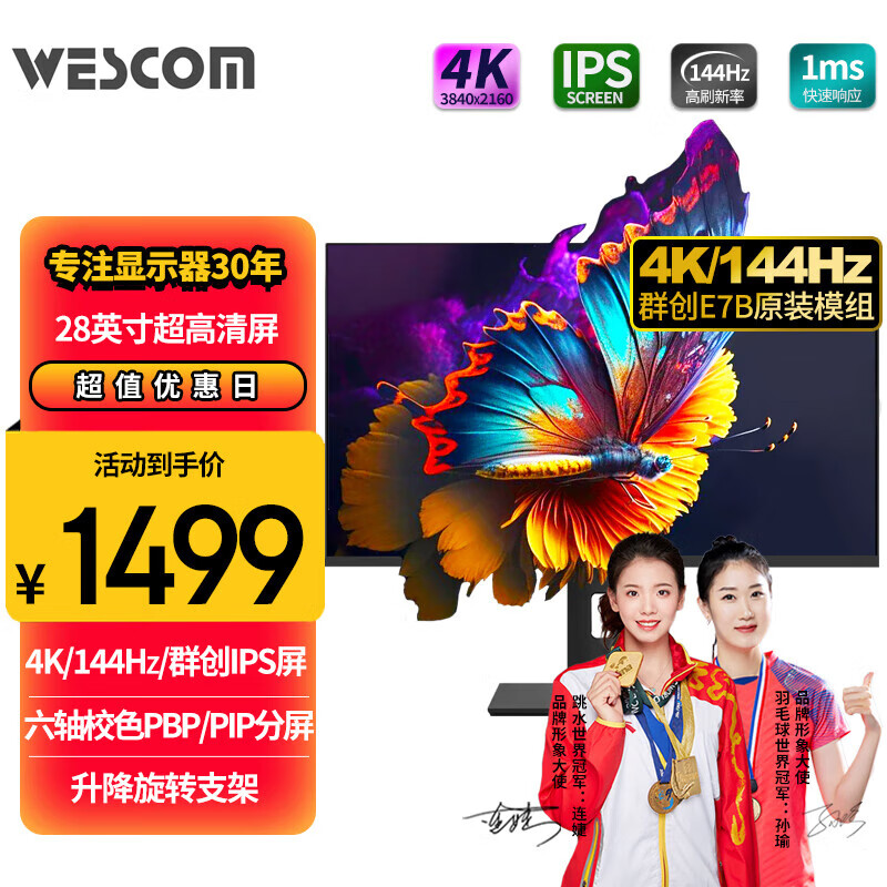 WESCOM 28英寸4K 144Hz FastIPS 1ms 六轴校色 PBP/PIP分屏 HDR 升降旋转 专业电竞游戏显示器W2886IDJUY/SJ价格:1899.00元!