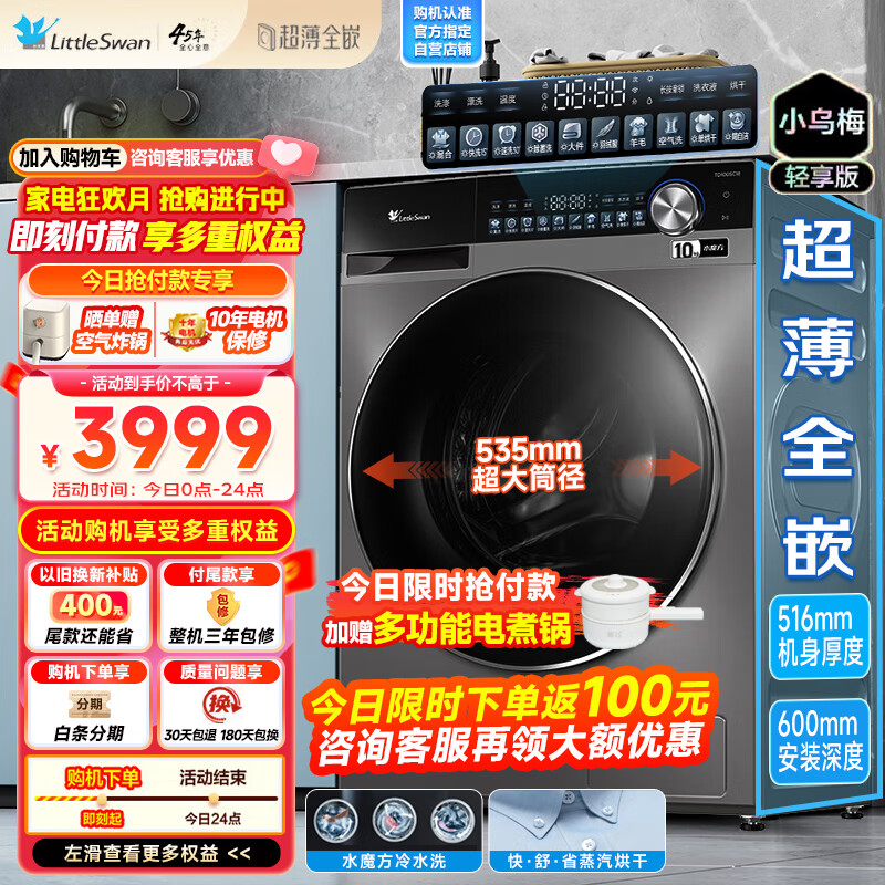 小天鹅(LittleSwan)10公斤全自动滚筒洗衣机 洗烘一体 水魔方 超薄全嵌-纤彩 小乌梅轻享版 TD100SC18【LVIC升级款】价格:4099.00元!