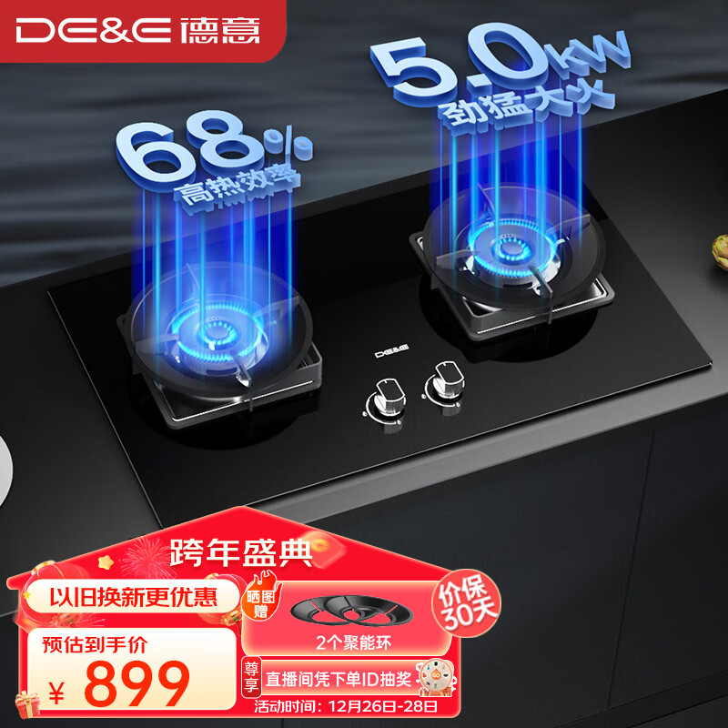 德意(DE&E)燃气灶 天然气 钢化玻璃 双眼灶具 5.0kW大火力 68%热效率 全尺寸适配嵌入式灶具 716A价格:899.00元!
