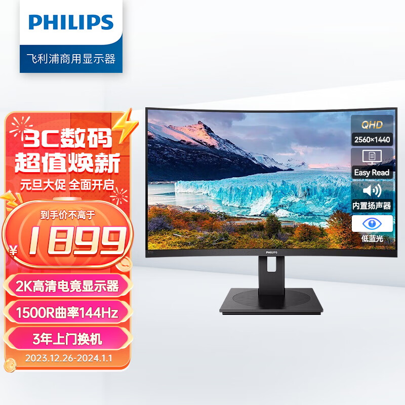 飞利浦 31.5英寸曲面显示器 2K高清 曲率1500R 144Hz刷新 122%sRGB色域 防撕裂技术 游戏电竞显示屏 325S1CAE价格:1899.00元!