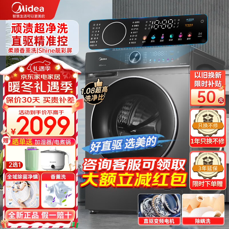 美的(Midea)家用滚筒洗衣机全自动 DD直驱变频电机 香薰洗 顽渍超精洗 新风袪味 10公斤彩屏 MG100V650DE价格:2099.00元!