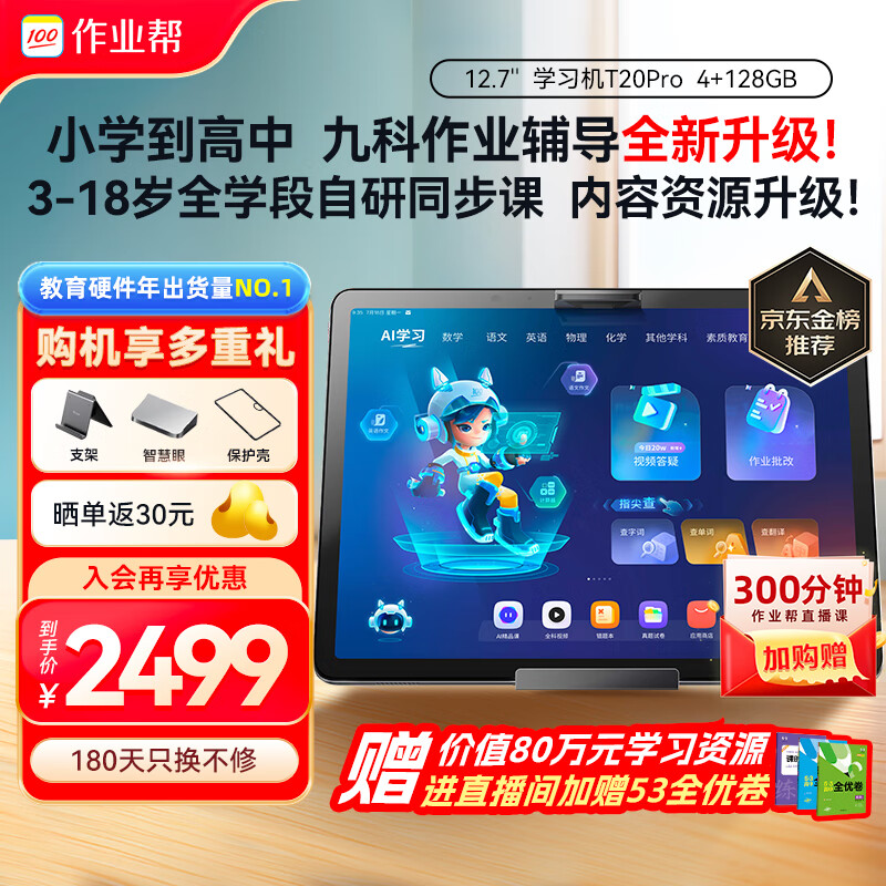 作业帮AI学习机T20Pro 学习平板小学到高中全科作业辅导【赠80万学习资源】家教机12.7英寸类纸护眼屏4+128GB价格:2499.00元!