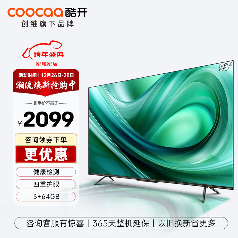 酷开创维 55英寸陪伴屏电视 3+64G 健康检测 防蓝光护眼 视频通话 120Hz高刷智能电视机以旧换新55P60P价格:2499.00元!