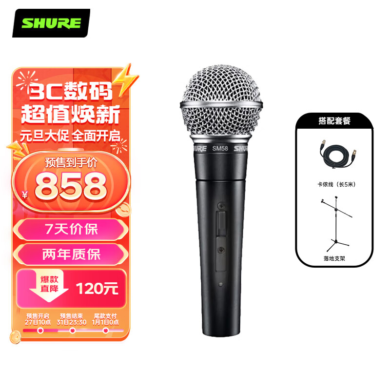 舒尔 Shure SM58S-CHN直播舞台表演出家用K歌动圈有线话筒麦克风SM58S-CHN+卡侬线+落地支架价格:857.00元!