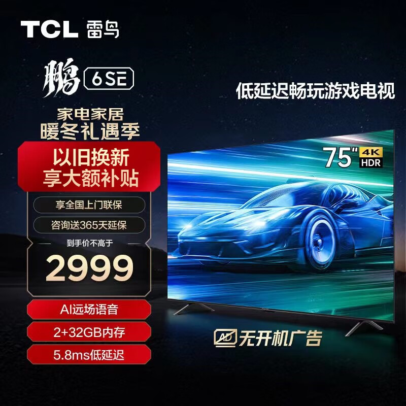 FFALCON雷鸟 鹏6SE 75英寸游戏电视 MEMC防抖 4K超高清屏 2+32GB 巨幕网络智能电视机 75S365C[黑]价格:2999.00元!