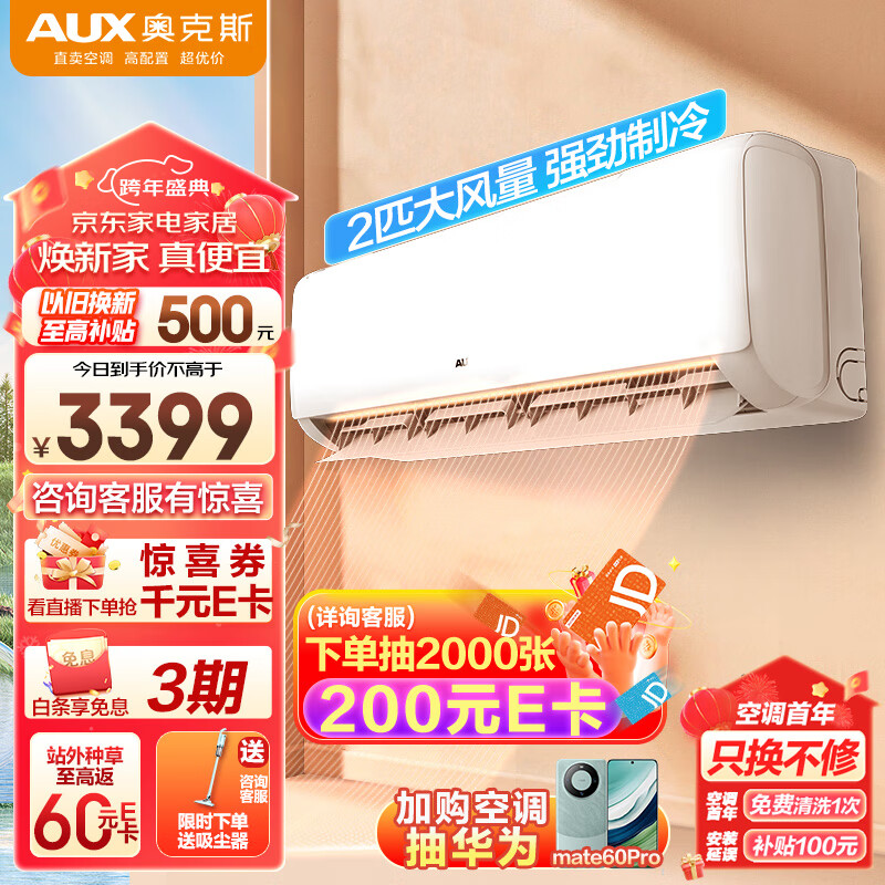 奥克斯(AUX)空调2匹 三级能效 挂机 自清洁 冷暖两用 家用壁挂式 变频 (KFR-50GW/BpR3ZAQK(B3))价格:3399.00元!