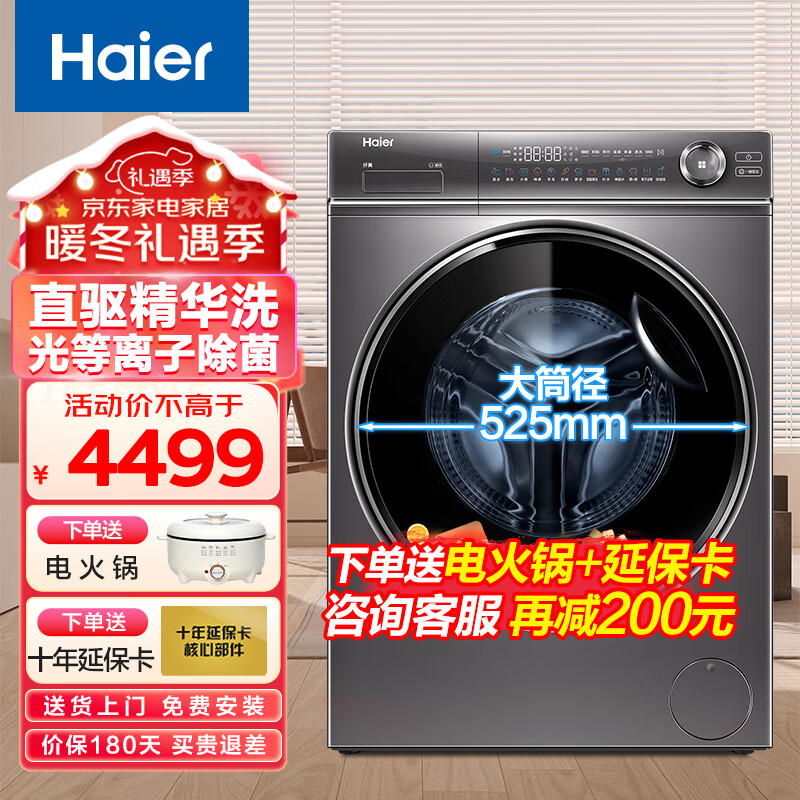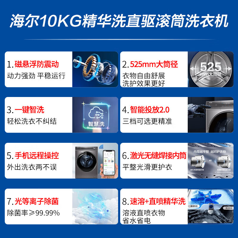 海尔(Haier)【直驱精华洗】10公斤直驱变频全自动滚筒洗衣机光等离子除菌除醛智能投放家用大容量388BD[家电]价格:4999.00元!