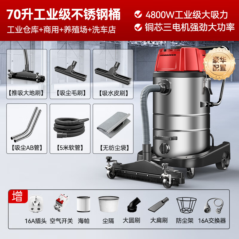 1、4800W大功率,买了使用了一周,非常好用,仓库内灰尘颗粒该有杨树毛都能吸,原来水泥地面全是尘土,现在比较干净了。大功率需要配电流大一些的电线,总体上用作仓库或者开荒累吸尘很好用。