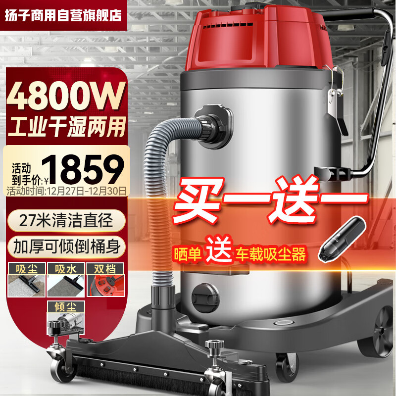 扬子(YANGZI)工业吸尘器4800W大功率干湿两用大吸力大型桶式商用吸尘器工厂车间仓库吸水机 70L推吸价格:2059.00元!