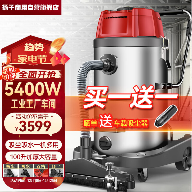 扬子(YANGZI)工业吸尘器5400W大功率干湿两用大吸力商用桶式吸尘机工厂车间厂房吸尘机 100L推吸价格:3799.00元!