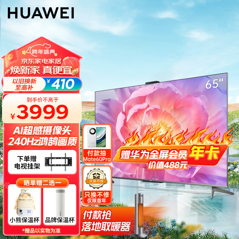 华为电视Vision智慧屏 3 65英寸超薄屏4K超高清240Hz鸿鹄画质AI摄像头智能液晶护眼电视机HD65QINA价格:3999.00元!