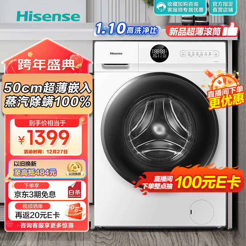 海信(Hisense)滚筒洗衣机全自动 10公斤家用大容量 500mm超薄 BLDC变频 除螨洗 护色洗 HG10JE1以旧换新价格:1499.00元!