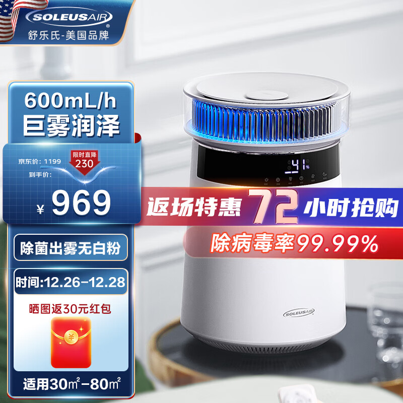 SOLEUSAIR舒乐氏加湿器卧室家用办公室空调伴侣大雾量孕妇婴儿用净化空气蒸腾加湿机 AHU-600Z1价格:969.00元!