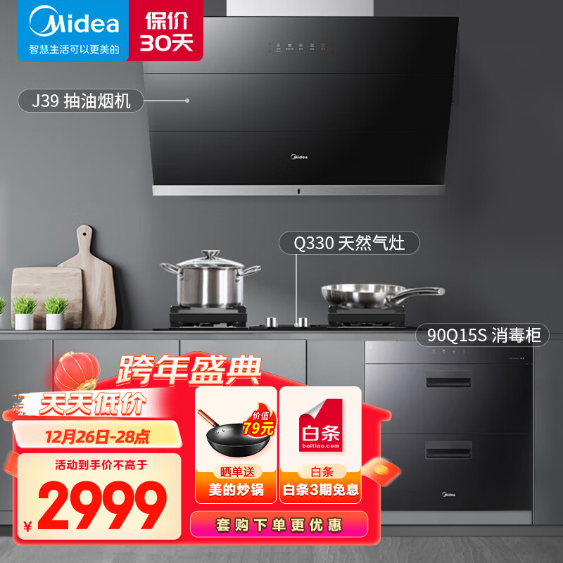 美的(Midea)烟灶消三件套侧吸智能干洗抽油烟机5.0KW火力燃气灶100L消毒柜J39+Q330+90Q15S(天然气)价格:2999.00元!