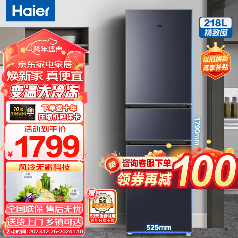 海尔(Haier)冰箱三门风冷无霜218升家用冰箱节能省电低噪黑金净化净味宿舍租房电冰箱 BCD-218WGHC3R9B9价格:1999.00元!