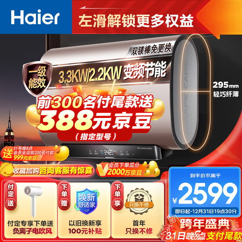 海尔(Haier)3300W速热 家用扁桶全隐藏式安装电热水器 双镁棒免换 EC5003-BOOK(U1) 【以旧换新】价格:2599.00元!