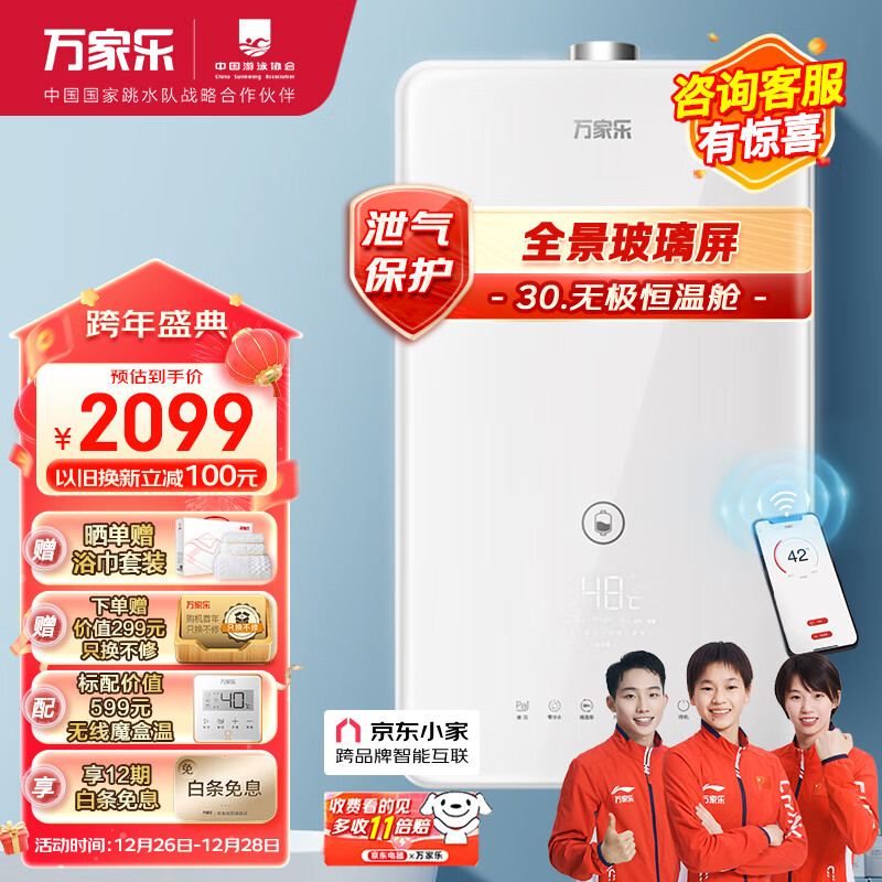 万家乐 18升防冻燃气热水器天然气无级恒温舱增压零冷水CO甲烷双安防京东小家智能三重净浴JSQ34-18RL5价格:2099.00元!