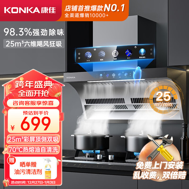 康佳(KONKA)抽油烟机 顶侧双吸式 7字型家用25m3爆炒大吸力 彩屏智能触控 挥手控制 自清洗 CXW-330-KL81价格:699.00元!